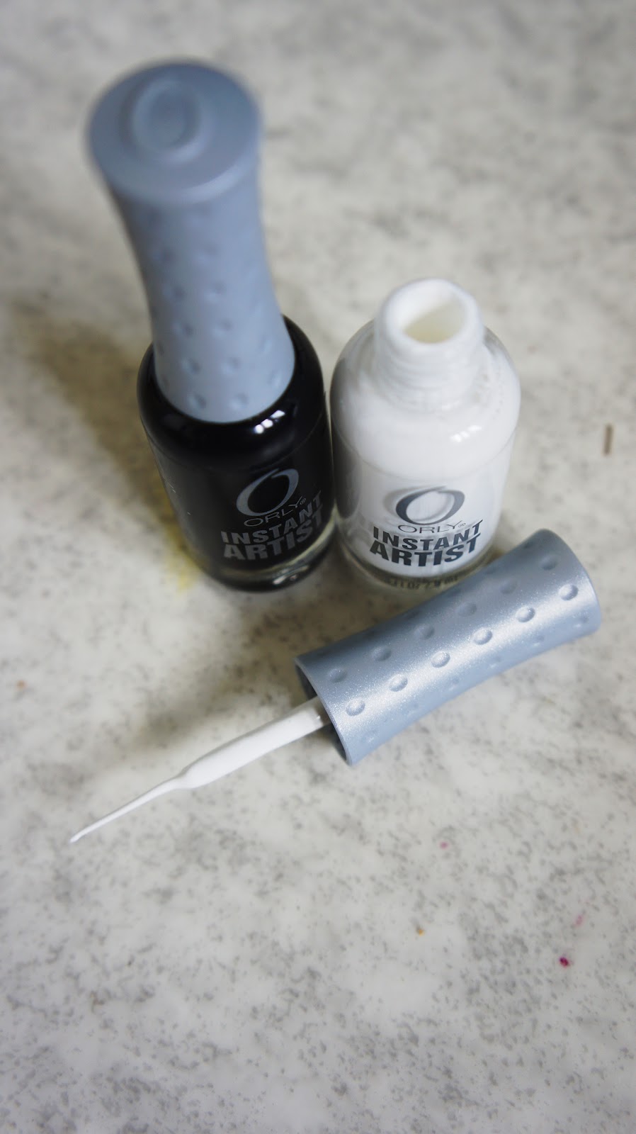 Oikealla kuva Orlyn Instant Artist tuotteista. Sivellin on muotoiltu valmiiksi ohueksi, jolloin kuvioiden piirtely on hyvin helppoa. Yksi purkki maksaa Stockmannilla 11,50€ ja värivalikoima siellä on yllättävän suuri. Jos harrastaa netissä shoppailua, niin esimerkiksi eBaysta niitä saa 2,70-5 dollarilla per purkki. Suosittelen ehdottomasti kyseistä tuotetta! Kynsitarrat olen tilannut netistä joltain suomenkieliseltä sivustolta.